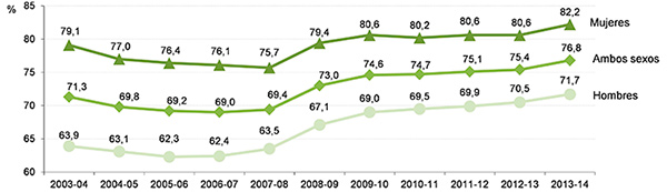 En primer lugar se presenta la evolución en las tasas de graduación en la ESO en España a partir del curso 2003-2004 hasta el último año de referencia 2013-2014, por sexo: