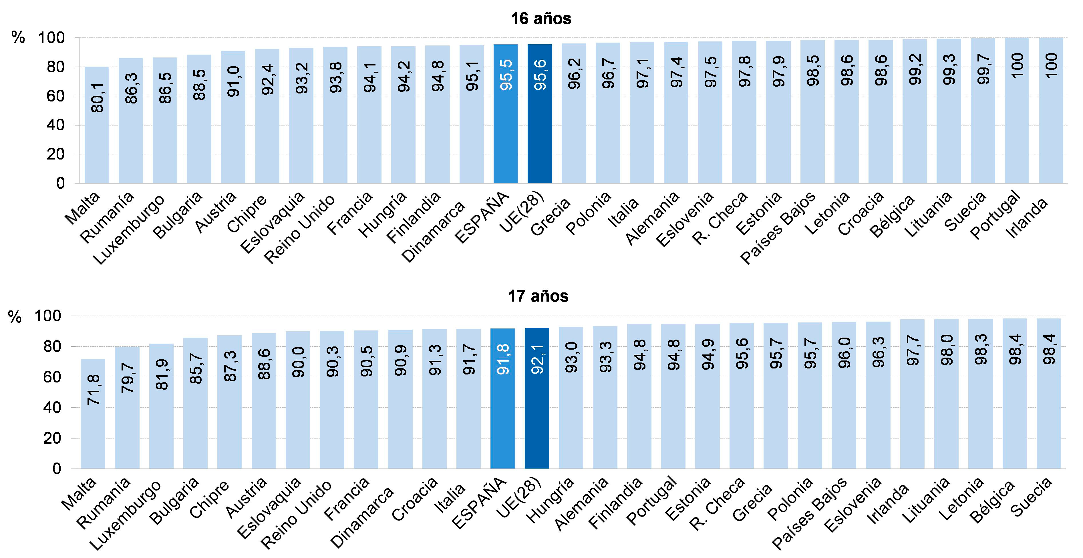 Por último, podemos ampliar la perspectiva de este estudio observando comparaciones a nivel internacional. De este modo, podemos evaluar la situación de nuestro país en comparación con otros países, en este caso de la Unión Europea. En la siguiente gráfica se muestra la tasa de escolarización de los alumnos de 16 y 17 años en los países de la Unión Europea en el año de referencia 2012-2013: