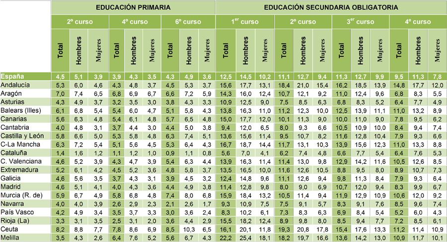 En esta tabla podemos observar los porcentajes de alumnado repetidor en el curso 2013-2014 en las distintas comunidades autónomas, por curso o ciclo de las etapas educativas obligatorias y por sexo.