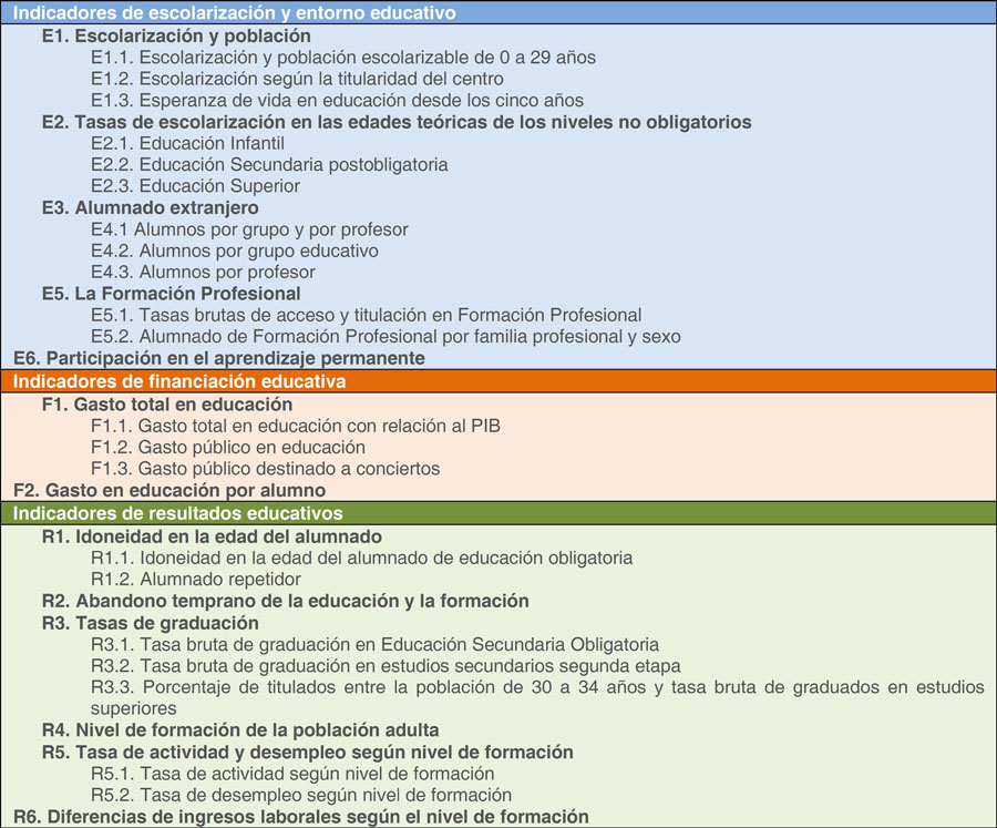 Esta última versión consta de tres apartados: Escolarización y entorno educativo, compuesto por seis indicadores; Financiación educativa, formado por dos y Resultados académicos, con seis. La publicación reúne un total de catorce indicadores donde se resume la situación actual y se compara a nivel geográfico, demográfico, económico y sociológico. Para ampliar y desarrollar la información, los indicadores se subdividen, en ocasiones, en subindicadores, lo que eleva su número real a 26. Esto permite enfocar la atención en aspectos más concretos y de forma más rápida.